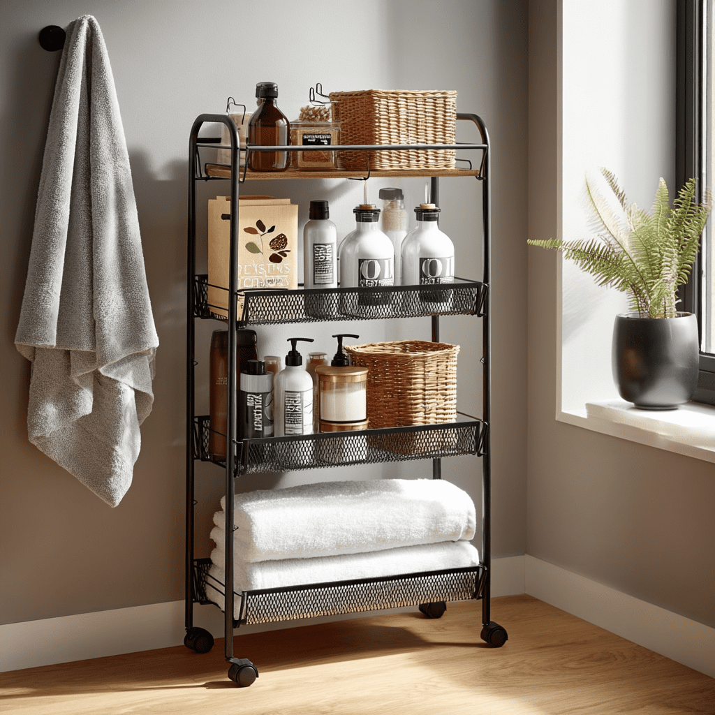 Use vertical shelves, hooks, rolling carts, cabinet-door organizers, and small corner shelves. Baskets and slim cabinets also work well in tight layouts.