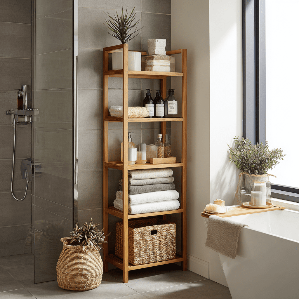 Vertical storage is essential in compact rooms. A tall shelving unit works beautifully as small bathroom shelving because it uses height rather than floor space.