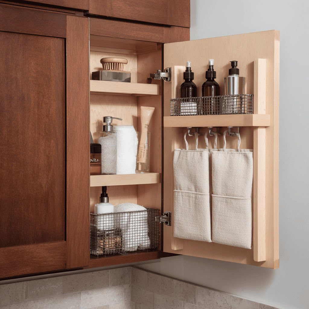 Use tension shelves, over-the-door organizers, adhesive hooks, slide-in drawers, and freestanding cabinets.