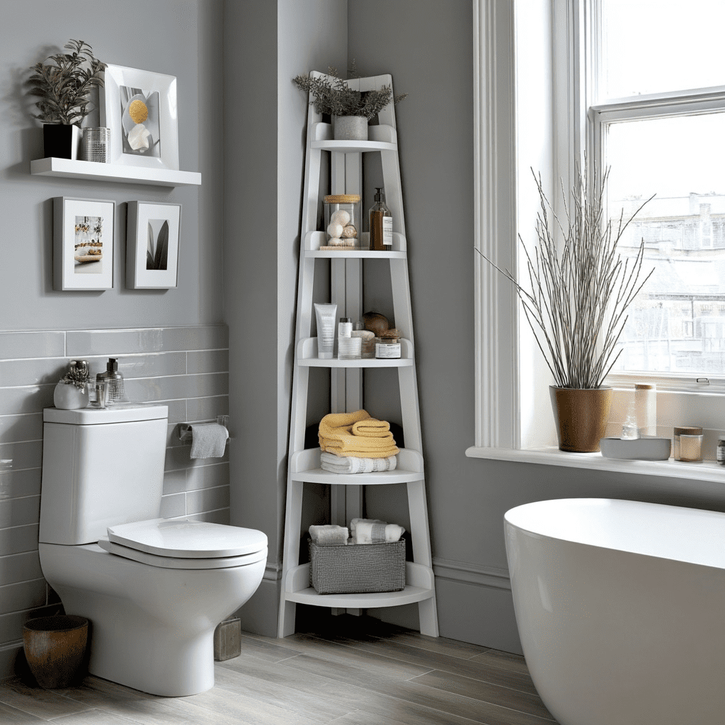 Corners are storage gold in tight bathrooms.
