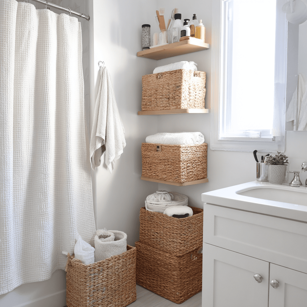 These are ideal bathroom storage ideas for small spaces because they add function without heaviness.