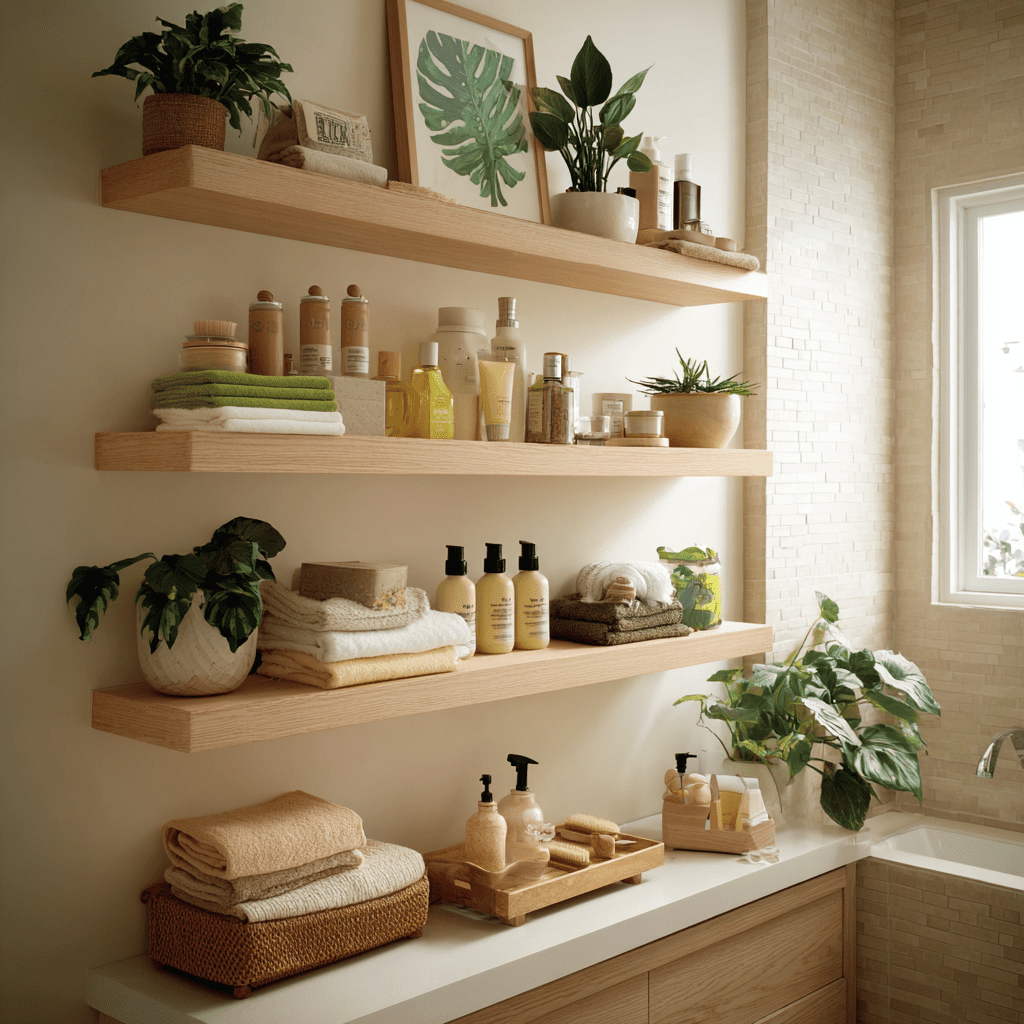 Display rolled towels, jars with essentials, plants, and small accessories. Keep shelves light to avoid visual clutter.