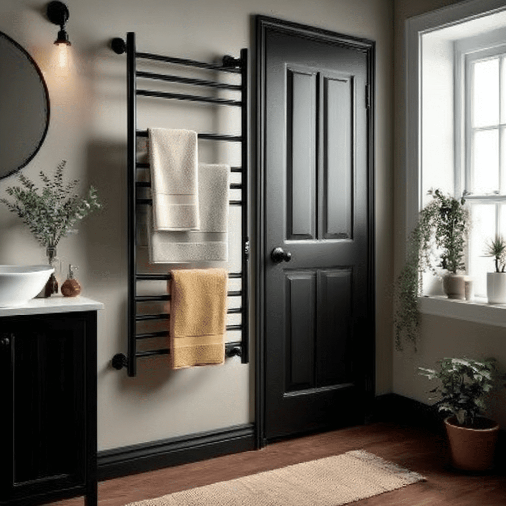 Try ladder shelves, hooks, vertical towel bars, woven baskets, or a slim over-the-door rack. These provide stylish towel storage for small bathroom layouts.