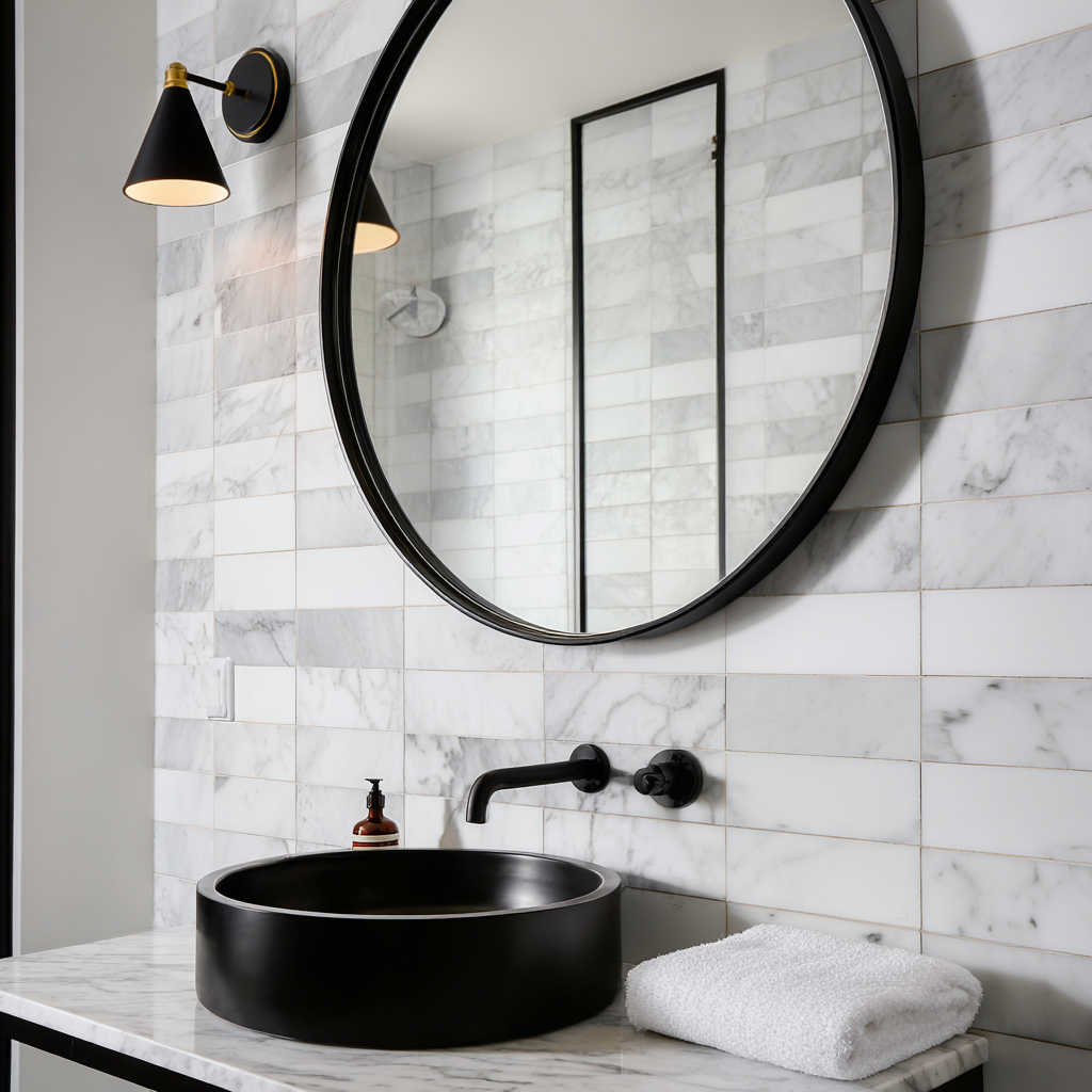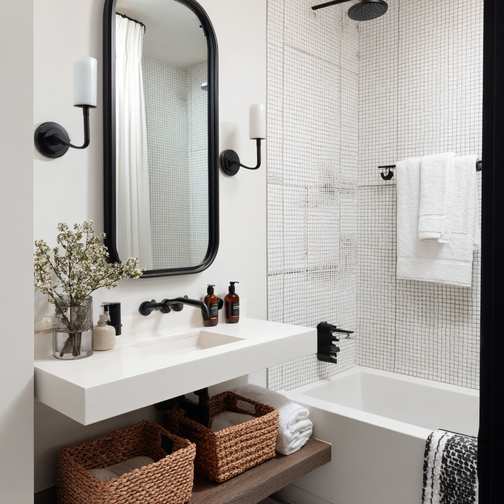 These ideas naturally tie in black and white small bathroom ideas and keep the space feeling modern.