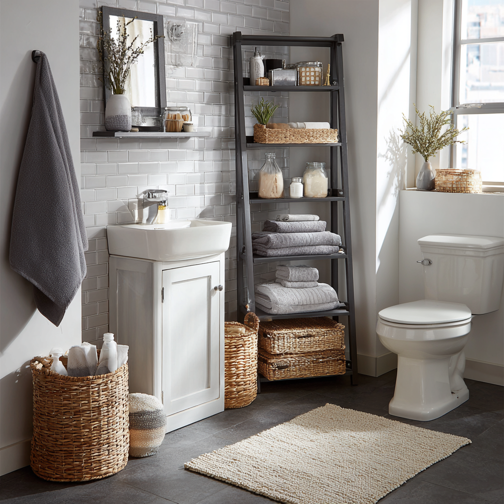 16. Use Slim, Vertical Storage for Tight Bathrooms