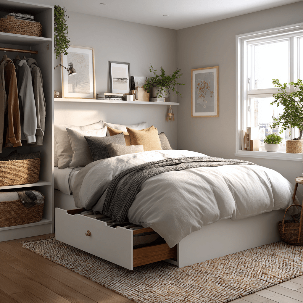 Every piece of furniture in a small bedroom should add value. If it can hold extra items or reduce surface clutter, it’s worth considering.