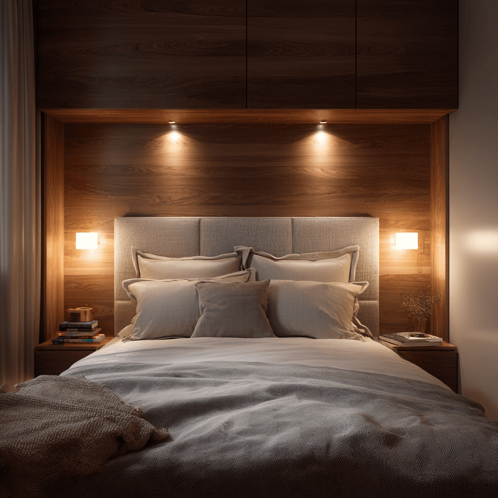 Warm, layered lighting — bedside lamps, wall sconces, LED strips, and soft pendant lights. Avoid harsh white lighting.
