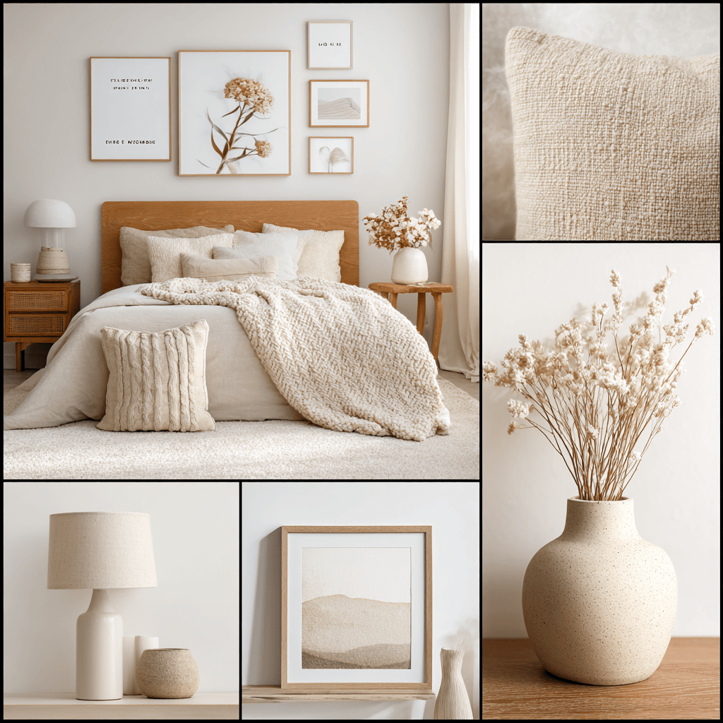Warm white, cream, oat, beige, taupe, greige, and light sand tones create a soft, airy foundation.