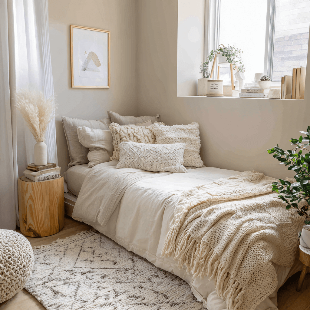 Neutral tones are incredibly powerful in small bedrooms. They soften harsh corners, brighten the room, and prevent the “busy” feeling that darker or louder colors can create.