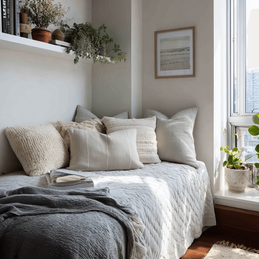 To bring the palette to life, layer different textures — cotton sheets, linen bedding, a woven rug, a knit throw, or light-wood accents. It’s the combination of textures, not color, that adds depth and comfort to a small room.