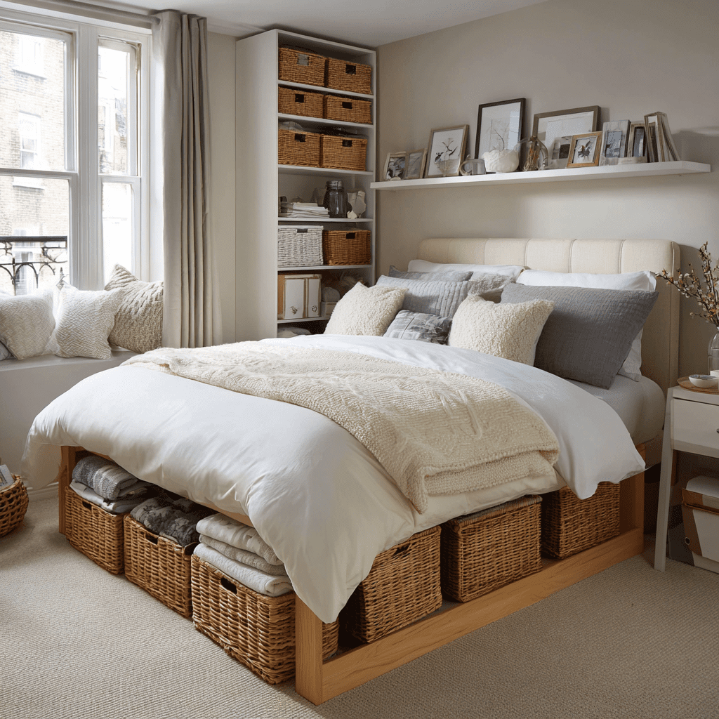 The space under your bed is a quiet helper. You can slide baskets, bins, or soft bags underneath to hold clothes, bedding, or shoes. This works especially well when you are using storage ideas for small bedroom without closet, because it creates room instantly without heavy furniture.
