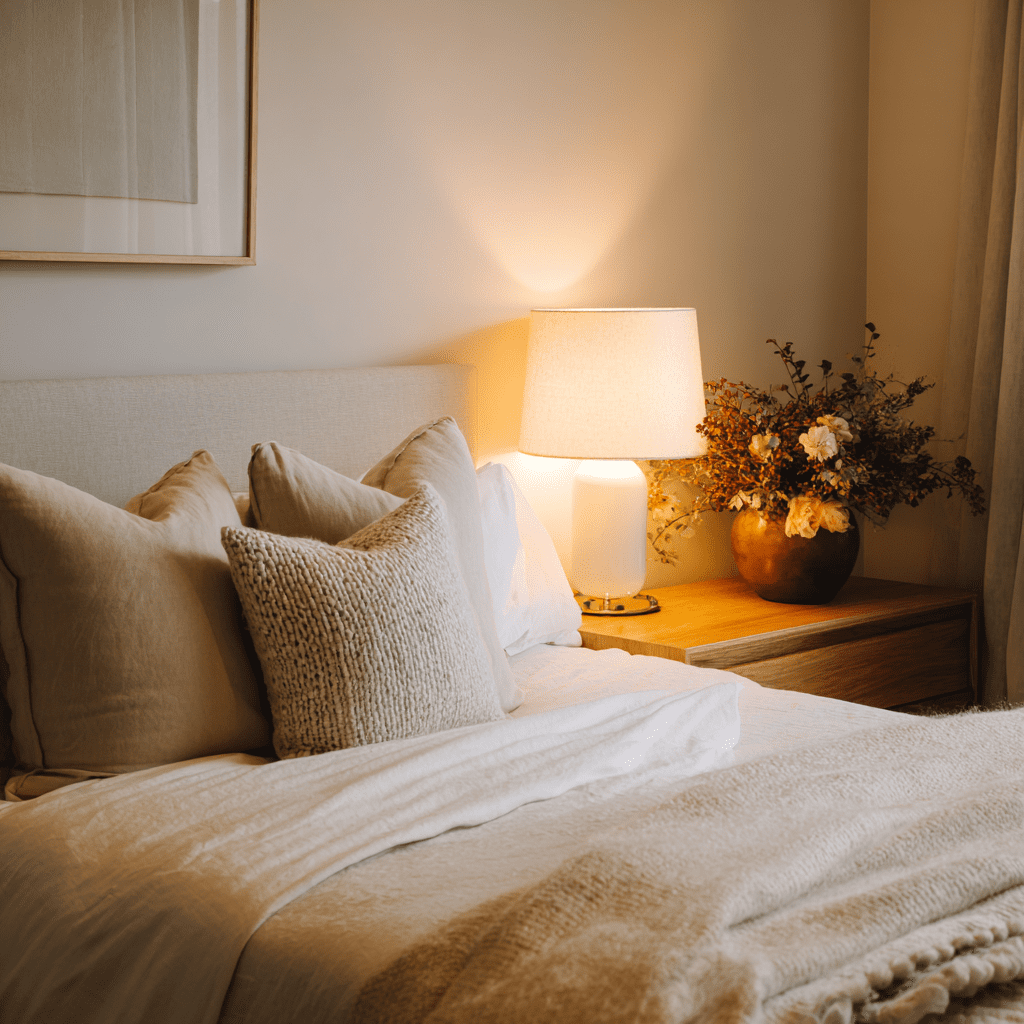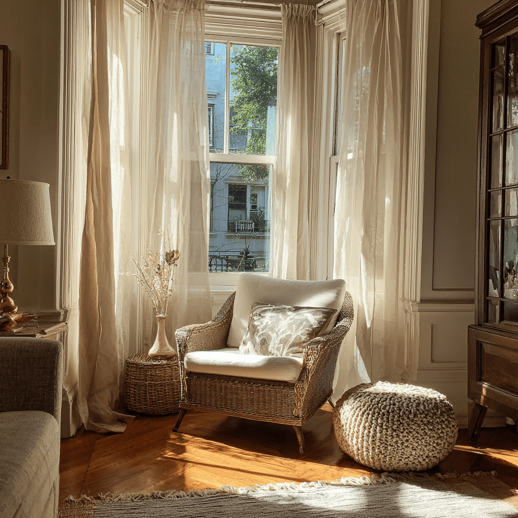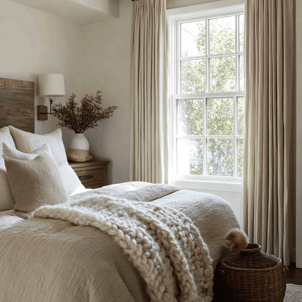Neutral curtains, blankets, and bedding create a soft background. They help small rooms feel quiet, warm, and uncluttered.