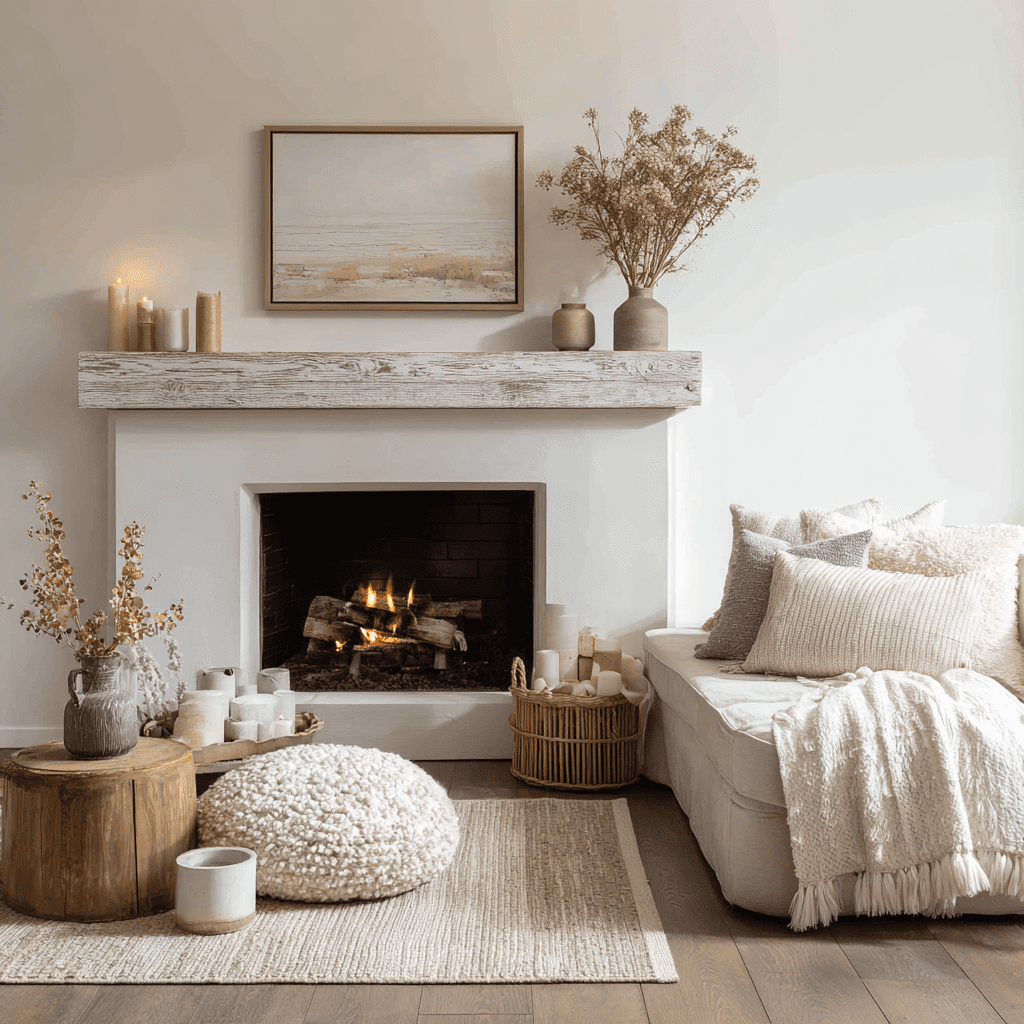 If you have a fireplace or even a small focal wall, soft textures and gentle colors help create a welcoming spot. Cozy candles, warm-toned art, or simple seasonal touches pair well with Rustic fireplace decor ideas for living rooms, bringing calm energy to the entire space.