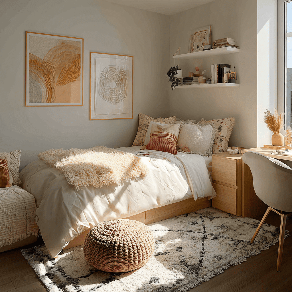 Student rooms can feel warm and peaceful with soft colors, simple lighting, and calm wall art. These gentle ideas blend nicely with Aesthetic dorm room decor ideas for student spaces, creating a cozy home even when the space is shared.