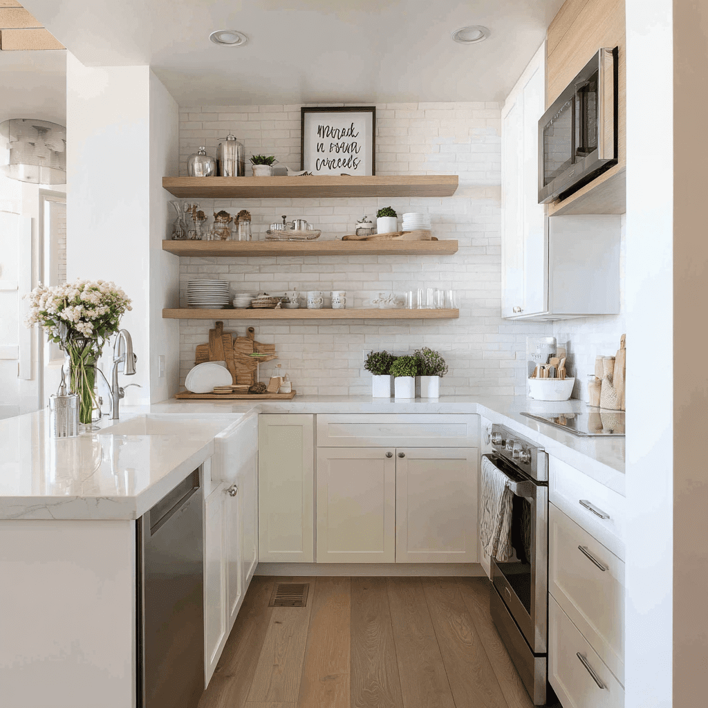 Small kitchens feel bigger when you lift decor upward. Open shelves, simple tones, and soft light help the kitchen breathe. These gentle touches fit well with Kitchen decor ideas to make small kitchens feel open, especially when every inch matters.