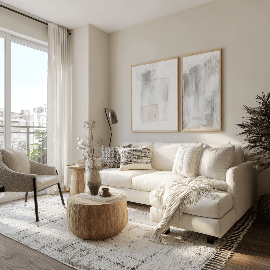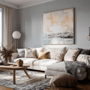 Walls make a big difference in small living rooms. Using simple art, soft colors, or a gentle collage helps the room feel taller and calmer. This idea works well for Living room wall decor ideas for small spaces because it keeps the room light instead of crowded.
