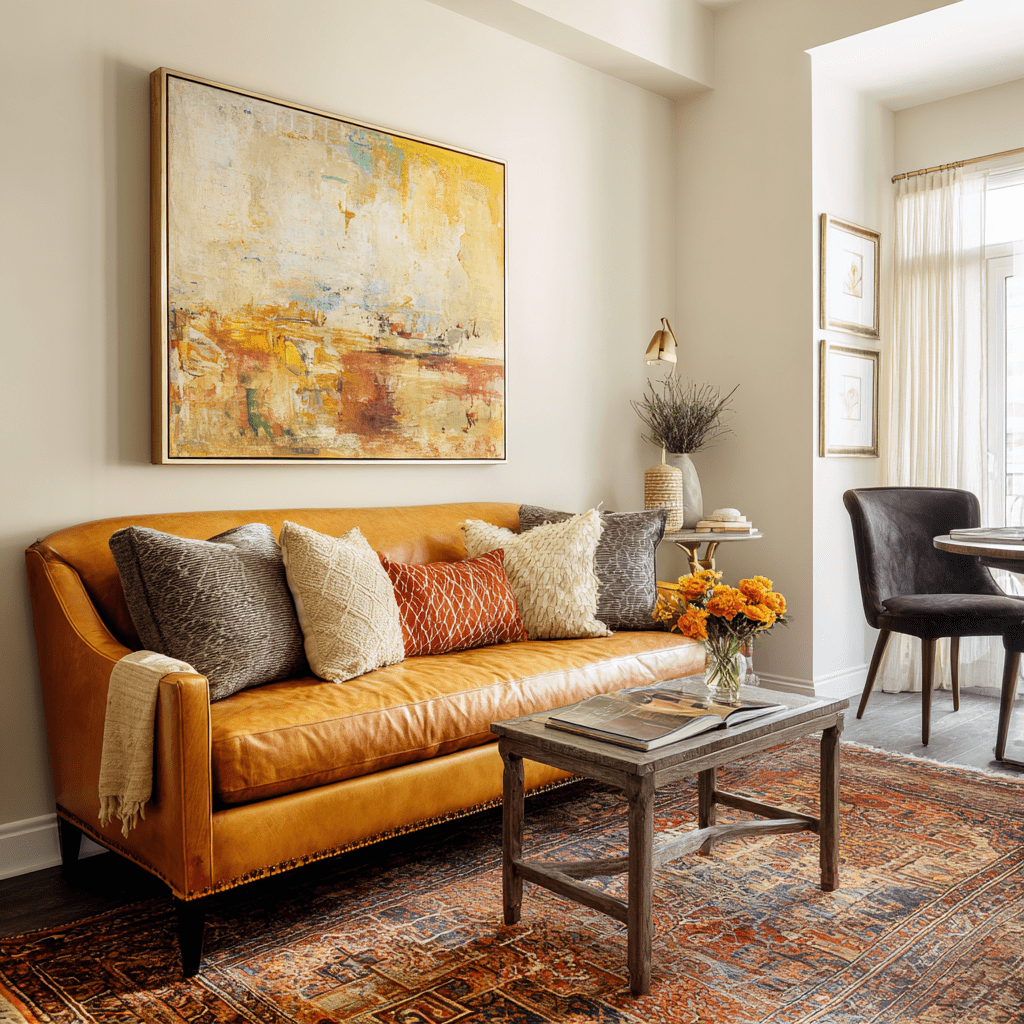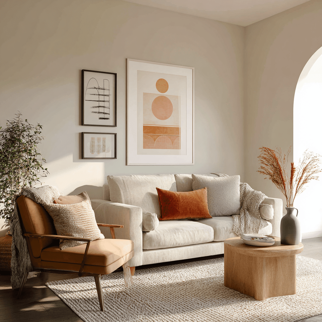 A simple way to open a small living room is by adding tall pieces that draw the eye upward. Soft prints, gentle shapes, or subtle neutrals help create space without adding clutter. This works beautifully with living room wall decor ideas for modern homes, where clean lines and open feeling matter.