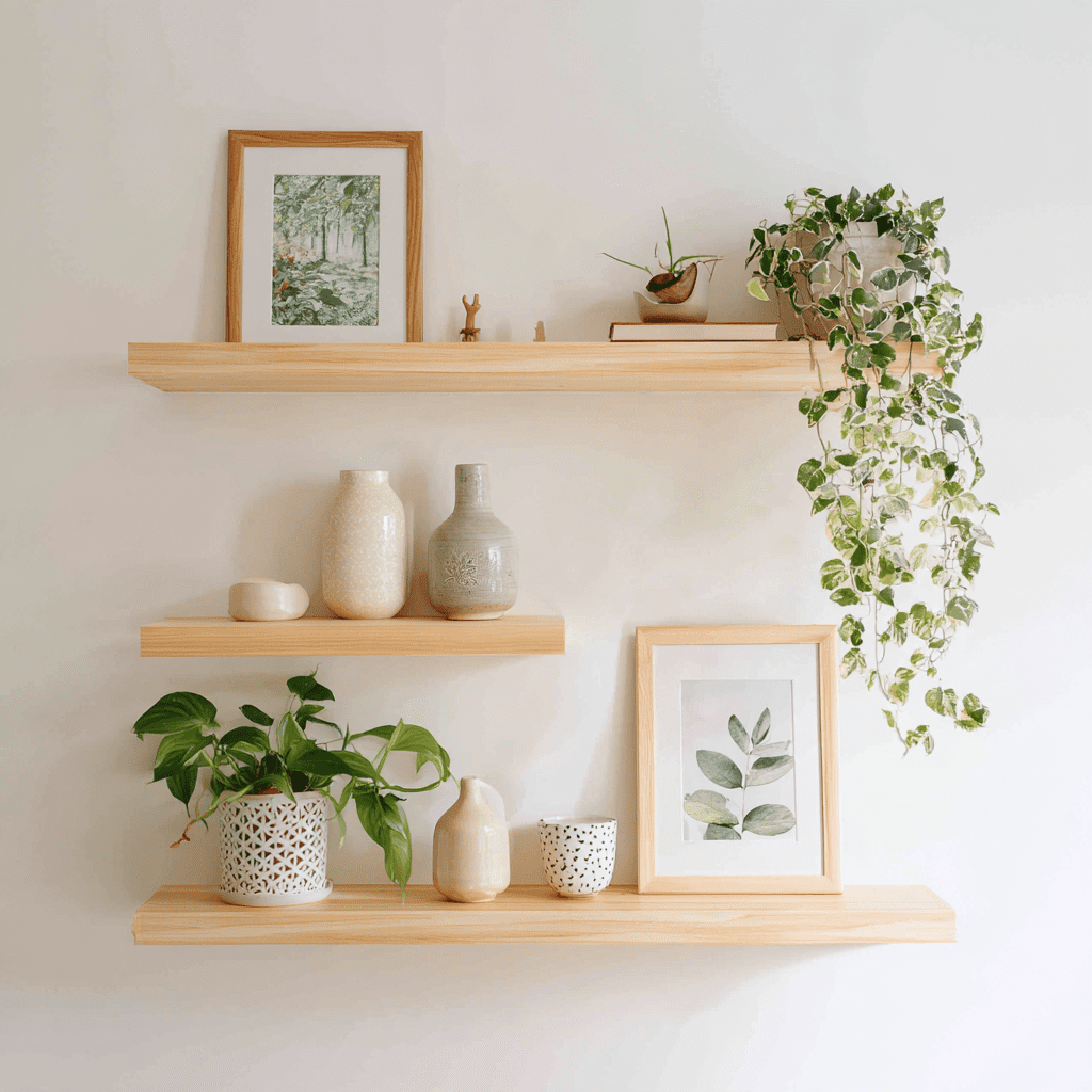 Floating shelves let you show a few gentle items — a photo, a plant, or a soft print — without taking floor space. They add beauty while keeping the room light.