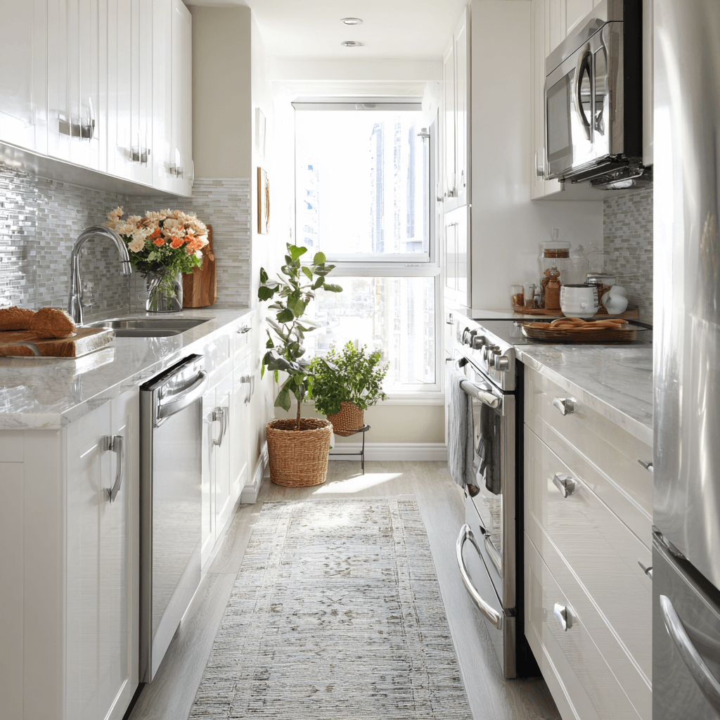 If all your cabinets and appliances sit on one wall, keep everything slim, vertical, and light.