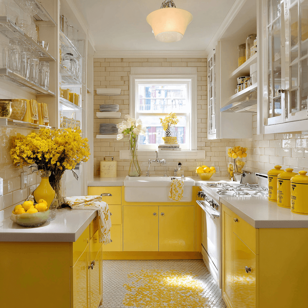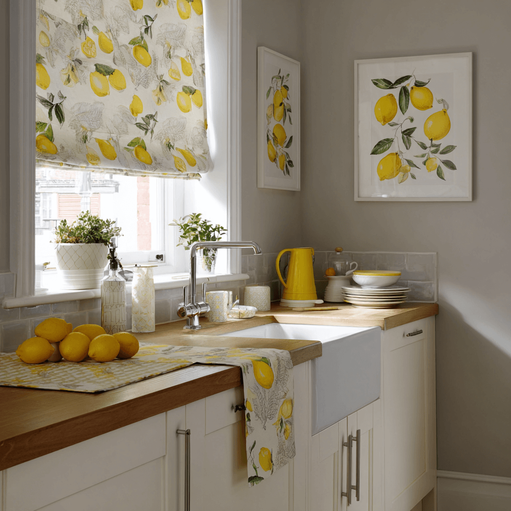 Use lemon artwork, lemon dish towels, or a lemon-patterned runner to bring gentle colour into a small kitchen.