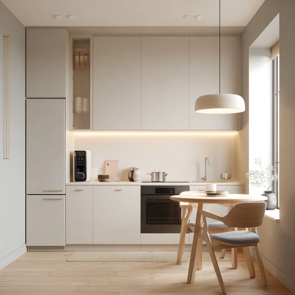 Minimalism creates a calm, slow-living feel in even the tiniest kitchens.